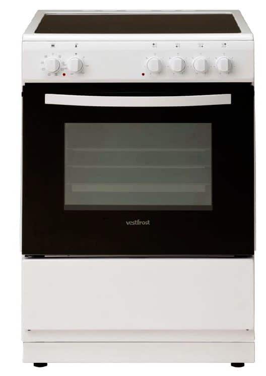 Hvidt keramisk Vestfrost komfur med 4 kogefelter og et ovnrum på 65 liter. Læs hele beskrivelsen