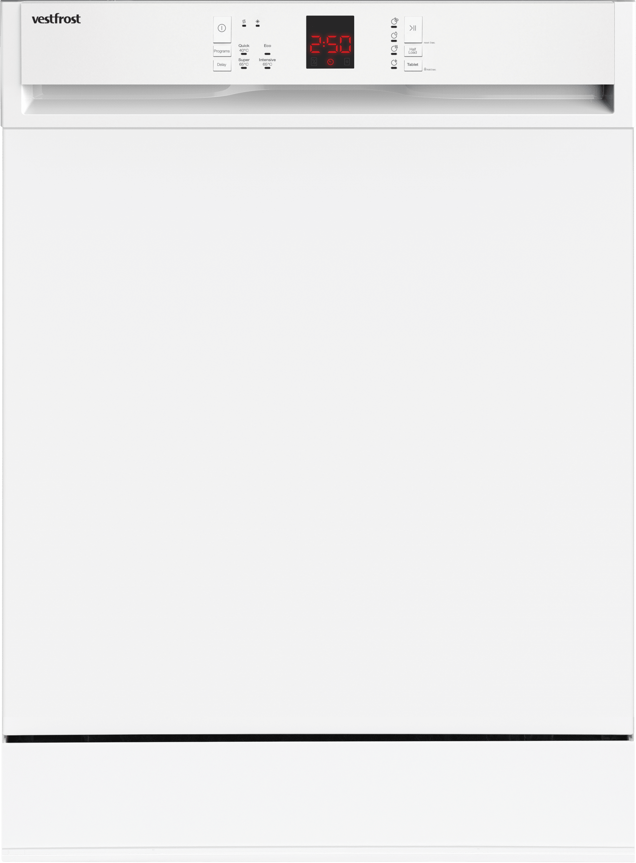 Opvaskemaskine til underbygning fra Vestfrost med udskudt start. 4 programmer og plads til 12 kuverter. Læs hele beskrivelsen